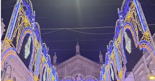 Le luminarie illuminano il paese che domenica 5 ottobre vedrà anche l'esibizione nella Bio Piazza di Cristina D'Avena, nell'ambito del programma civile che si affianca a quello religioso.