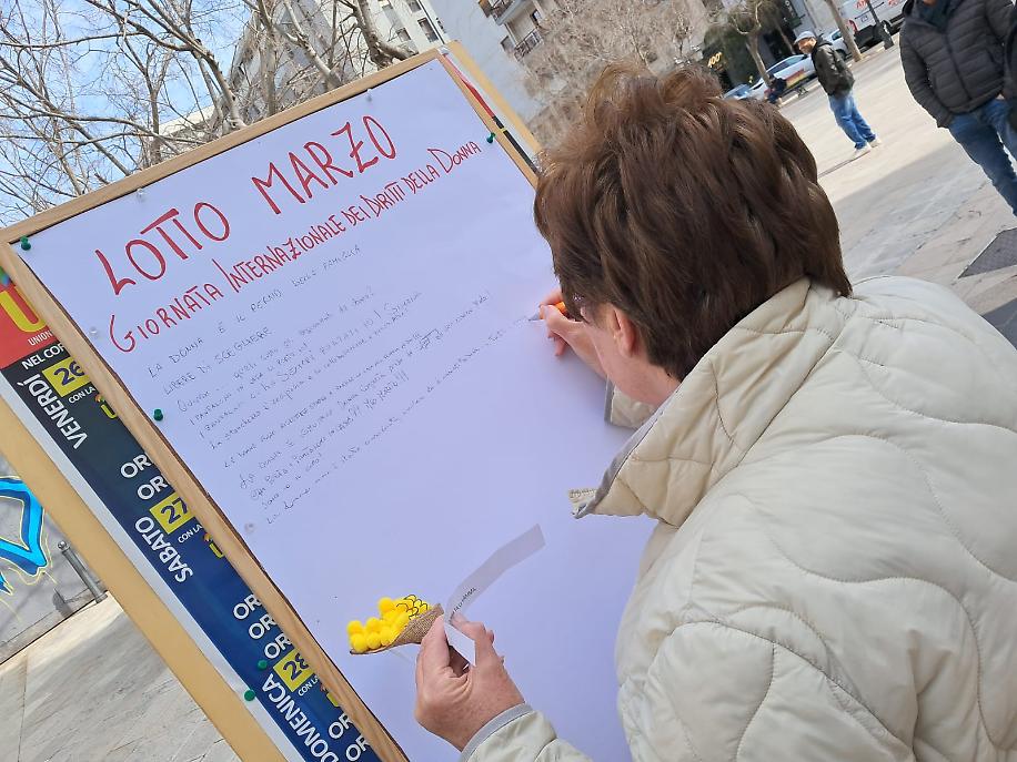 Ieri mattina, in piazza della Vittoria, la bacheca dell'Usb è stata l'occasione per cittadine e cittadini di passaggio, per esprimere il proprio pensiero nella giornata dell'8 marzo. Tra le frasi scritte, quelle da depennare, quelle che ancora si sentono e che mirano chiaramente a sminuire la donna, come "Qui i pantaloni li porto io", altre che sottolineano la libertà e la forza della donna, come "Libere di scegliere", altre ancora, come "Quindi ...quali sono gli argomenti da donna" sfidano atteggiamenti e luoghi comuni tipicamente maschilisti. Le frasi lasciate sono tantissime e, cosa che ha portato tanto entusiasmo a organizzatrici e organizzatori non solo il successo riscontrato, ma anche l'importante partecipazione di uomini che hanno contribuito a riempire di significato un momento come quello di ieri.