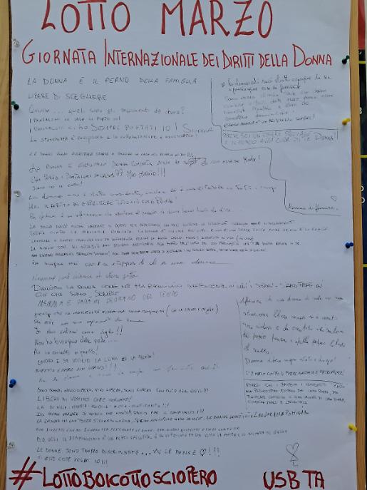 Angela Lafratta, segreteria provinciale Usb Taranto: "Quella di ieri non è una festa. Lo abbiamo ripetuto più volte, e il voler mettere in piazza una bacheca dove poter scrivere le parole, dette e ripetute, sia quelle degli uomini e purtroppo anche di alcune donne, ancora portatori di una cultura patriarcale, sia quelle di chi invece esprimono chiaramente il concetto della parità tra i generi, ha permesso di dare concretezza all'8 marzo".