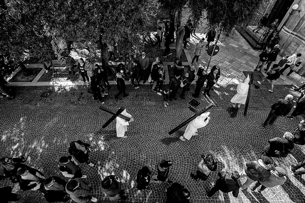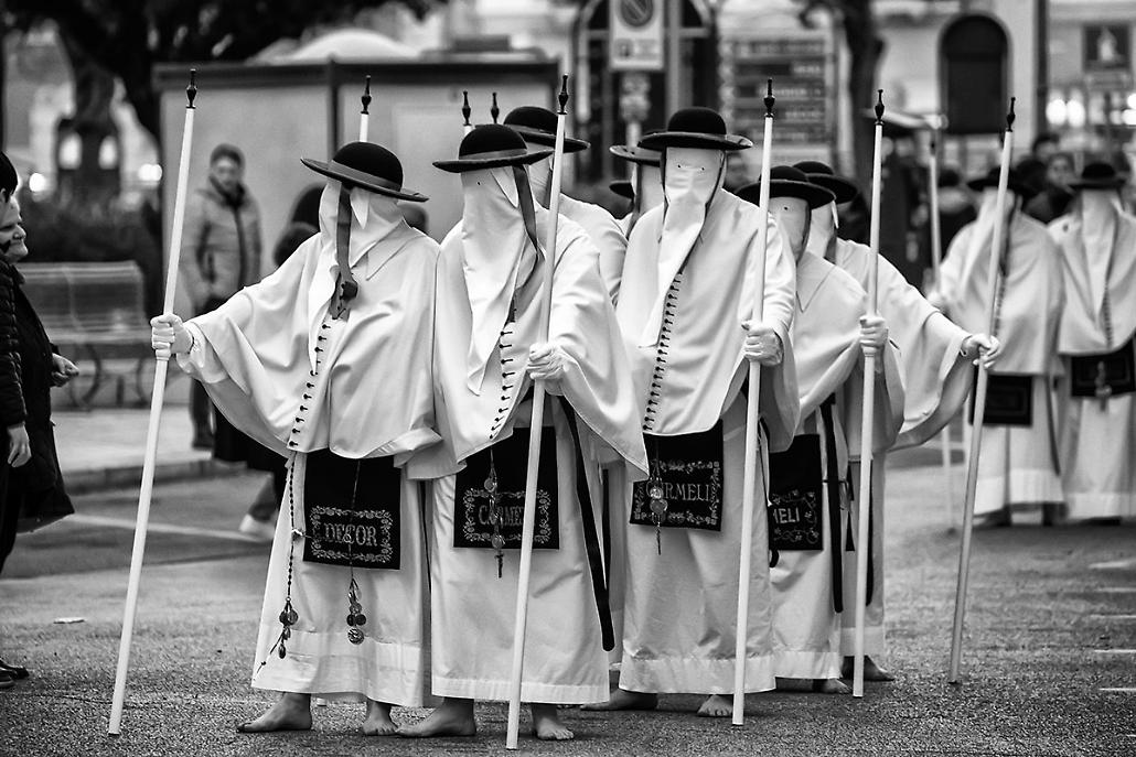 Nei suoi scatti, la Settimana Santa si spoglia del superfluo e si concentra sull’essenziale. Le cappe bianche dei confratelli, i volti coperti, i piedi che avanzano lentamente lungo il selciato diventano segni visivi di un tempo dilatato, quasi fuori dalla storia. La Fratta riesce a cogliere il ritmo unico di questi riti, fatto di pause, attese e silenzi, restituendo immagini che sembrano sospese tra fotografia e memoria.