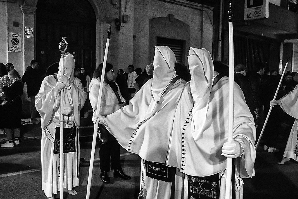 Dietro ogni figura incappucciata si percepisce una presenza viva, una comunità che si riconosce nel rito. La Fratta non si limita a osservare, ma partecipa, entra nel respiro collettivo della città, riuscendo a restituire quella tensione emotiva che rende unica la Settimana Santa tarantina.