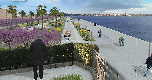 Un rendering del progetto che prevede la realizzazione del waterfront Mar Piccolo