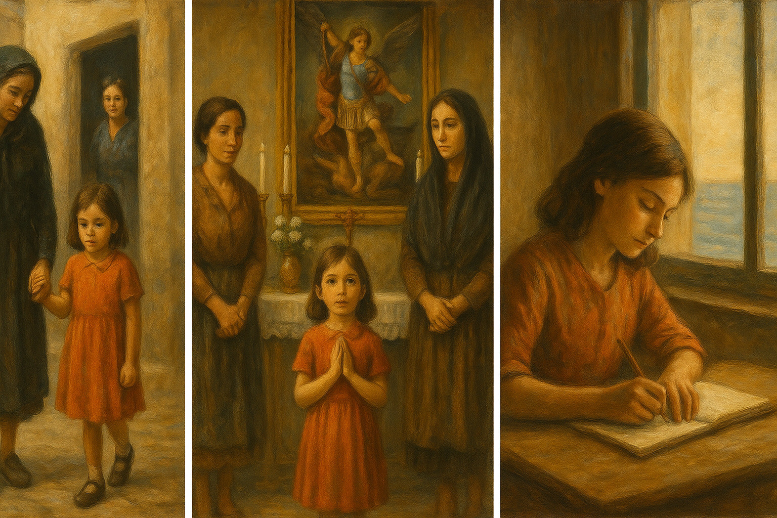 La zia Maria e mamma Rita, davanti all’altare, fecero giurare a Esterina che doveva dimenticare la casa in cui era nata e che mai più avrebbe fatto il gesto di scappare. La zia disse alla bambina: «Giura! Alza la mano e giura davanti a Dio che starai sempre con me». Esterina, piangendo, giurò. Così, da quel giorno, la bimba promise e mantenne il suo giuramento.