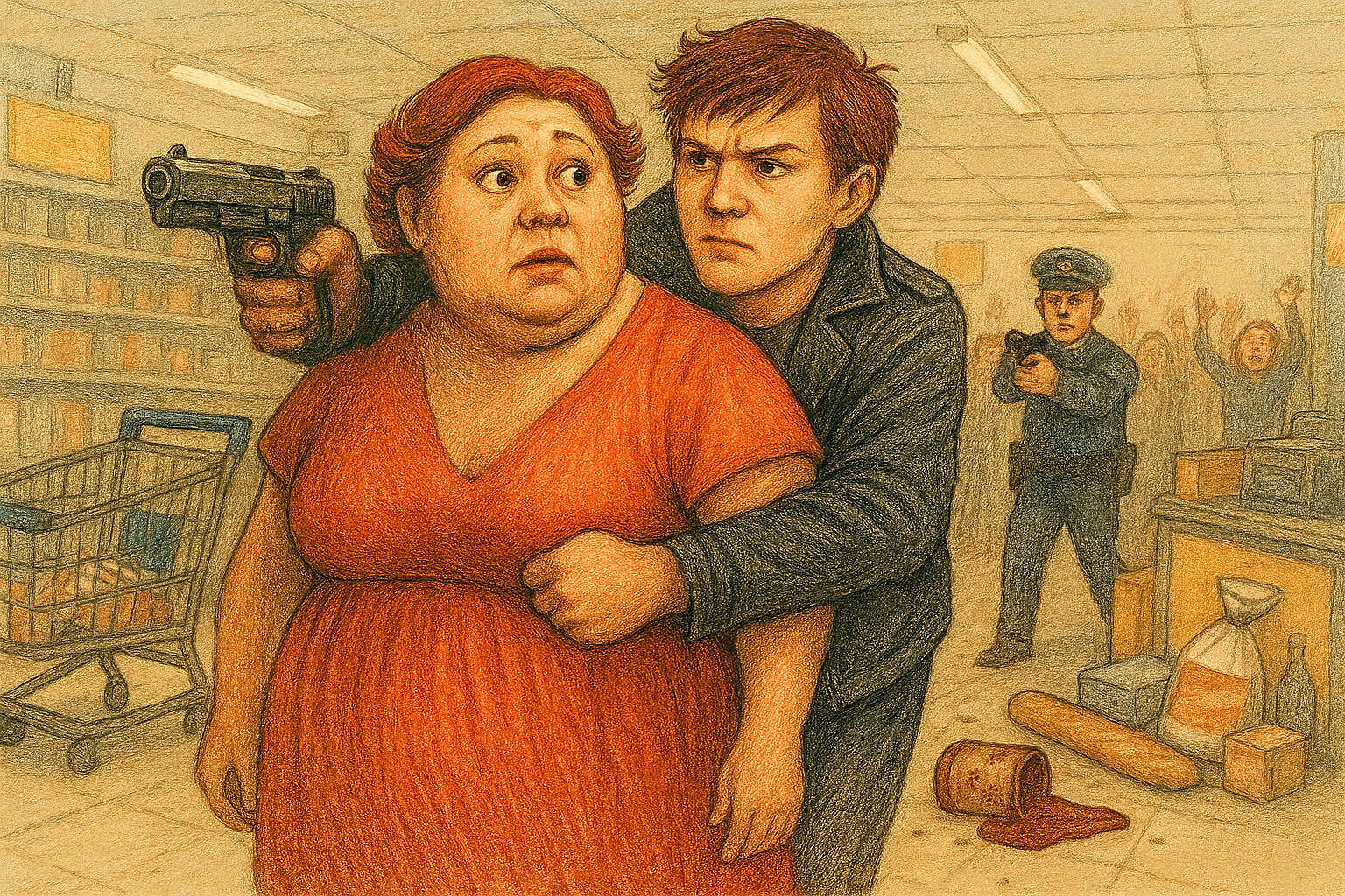 La cassiera preleva un mazzetto di euro e glielo porge. Lui lo fa sparire e si avvia all’uscita. Tiro un sospiro di sollievo: pericolo scampato. Qualcuno, però, ha chiamato la polizia, e il ragazzo rientra di corsa. Ricomincia il terrore.