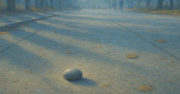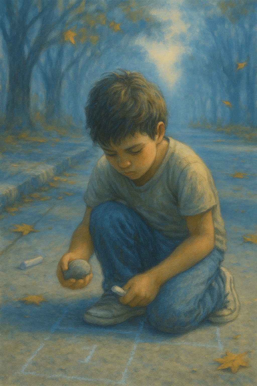 Un giorno camminava, distratto. Come di consueto. I suoi occhi fissavano il cemento senza vederlo. Ed ecco che successe. Un piccolo imprevisto. L’unica azione inattesa della sua vita. Inciampò. Non cadde, ma il suo piede urtò qualcosa di duro. Si fermò. Si abbassò, e la sua mano toccò qualcosa. Ero io. Si ferma. Mi guarda. Ma non come fanno tutti gli altri, sbadati, veloci. Mi guarda veramente. Si piega, mi raccoglie con le sue mani, piccole e tiepide. Mi gira tra le dita. La sua fronte si corruga appena appena. Cosa farne di me? Io resto sasso. Non posso cambiare. Non posso fare nulla. E invece no. Il bambino mi porta con lui. Si siede a terra. È pensieroso. Poi, i suoi occhi vedono i segni sbiaditi dei gessetti colorati sul cemento. I resti di un gioco antico. Scatole disegnate, numeri quasi completamente cancellati.