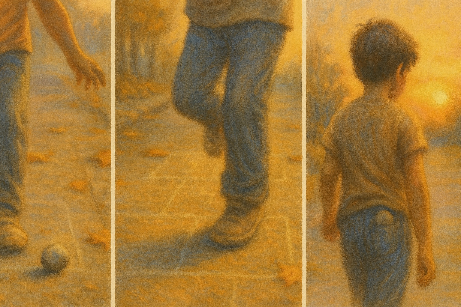Accadde l’impossibile. Il bambino si guarda intorno. Non c’era nessuno a vederlo. Raccoglie un gessetto consumato, abbandonato monco, accanto ad un muretto, e traccia con la destra righe, quadrati, numeri. Disegna un rettangolo, poi un altro, fino a formare un percorso. Io non capisco. Ma resto fermo nell’altra mano, quella mancina. Poi, all’improvviso, mi lancia. Non me l’aspettavo. Volo! Io, che non mi sono mai mosso in vita mia, volo. Atterro dentro un quadrato con i bordi colorati di azzurro. E lui salta. Salta con un piede solo, come un fenicottero. Poi con due, poi ancora. Ride. Ride forte. Il suo volto si aprì in una smorfia che non avevo mai visto: era il sorriso felice di chi gioca davvero. Lui continuò a zompettare, a spingere il mio corpo liscio da una casella all’altra. Non mi muovevo da solo, mi muovevo con lui. Il sole calava, verniciando il cielo di pesca matura e di ombre allungate. Il bambino non era più un’ombra senza bordi. Era un corpo in movimento, un suono, una risata fino ad allora sconosciuta, che si diffondeva nell’aria tiepida. Quando fu stanco, mi prese. Mi tenne stretto, strofinandomi con le dita. Non mi lasciò cadere, non mi lanciò. La sua mano non era più vuota. Poi mi mise nella tasca dei suoi pantaloni. Sentivo che il mio destino non era più il cemento freddo. Era il calore della stoffa, il ritmo del suo passo, la voce del suo respiro che rincasava. Io non faccio nulla. Sono sempre lo stesso. Ma adesso mi sento utile. Servo a giocare. E lui gioca. Gioca come non aveva mai fatto. Corre, salta, si piega, mi raccoglie e mi lancia. Ancora una volta. Io sono parte del suo gioco. Io sono diventato compagno. Il sole brilla più chiaro. L’aria profuma di polvere e sorrisi. La strada non è più deserta, è piena di gessi colorati e piedi che pestano. Io non sono più solo. Neanche lui. Due solitudini che si incrociano, che si incontrano. Io, sasso che non facevo mai niente, e lui, bambino che non aveva mai giocato. Adesso c’è movimento, c’è rumore, c’è allegria. Prima eravamo niente. Adesso siamo qualcosa. Qualcosa di più. Non uno più uno, ma molto di più. E io, che non facevo niente, ora gioco. Con lui. E lui, che non faceva niente, ora vive. Con me.