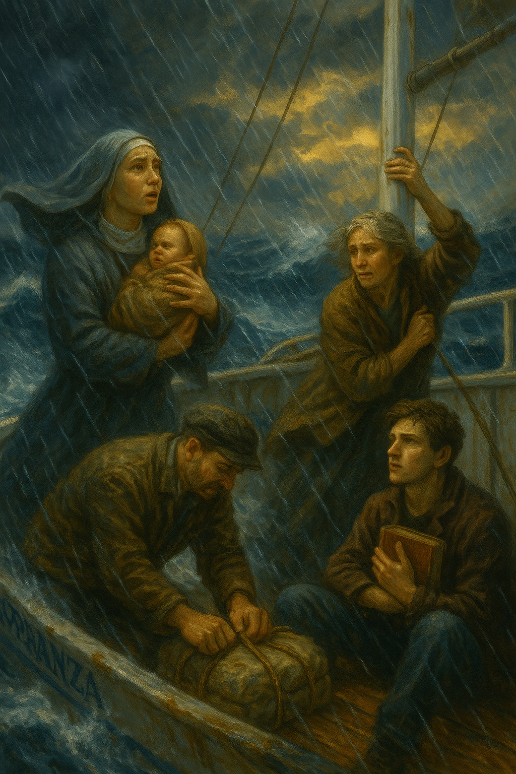 Suor Anna, con coraggio, raccolse un neonato piangente tra le braccia e pregò a voce alta, mentre la pioggia le bagnava il velo. Zia Carmela aiutò Salvatore a fissare i sacchetti di viveri, avvolgendoli in teli cerati. Tonino, seduto contro la paratia, chiuse il libro ma poi aprì lo sguardo all’orizzonte, sfidando la tempesta.