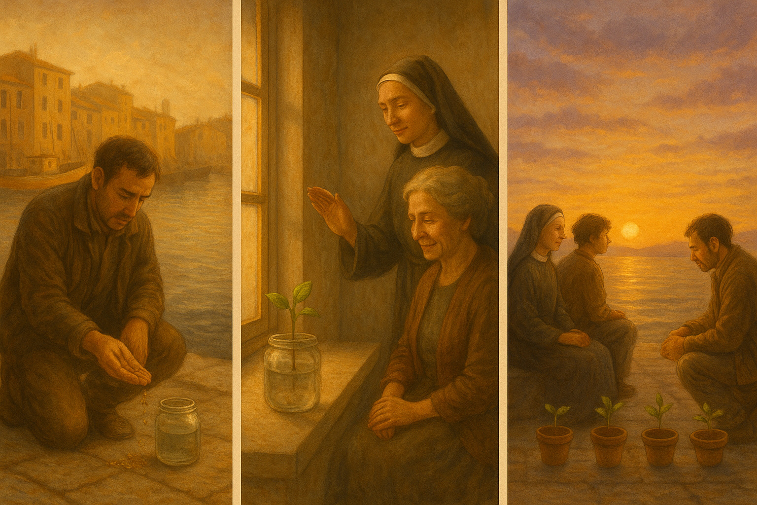 Settimane dopo, in una piccola stanza di pensione, spuntò un germoglio verde. Fragile ma determinato, sfidava il vetro del davanzale. Zia Carmela sorrise con dolcezza, suor Anna lo benedisse con un gesto lieve, e Tonino annotò sul diario: