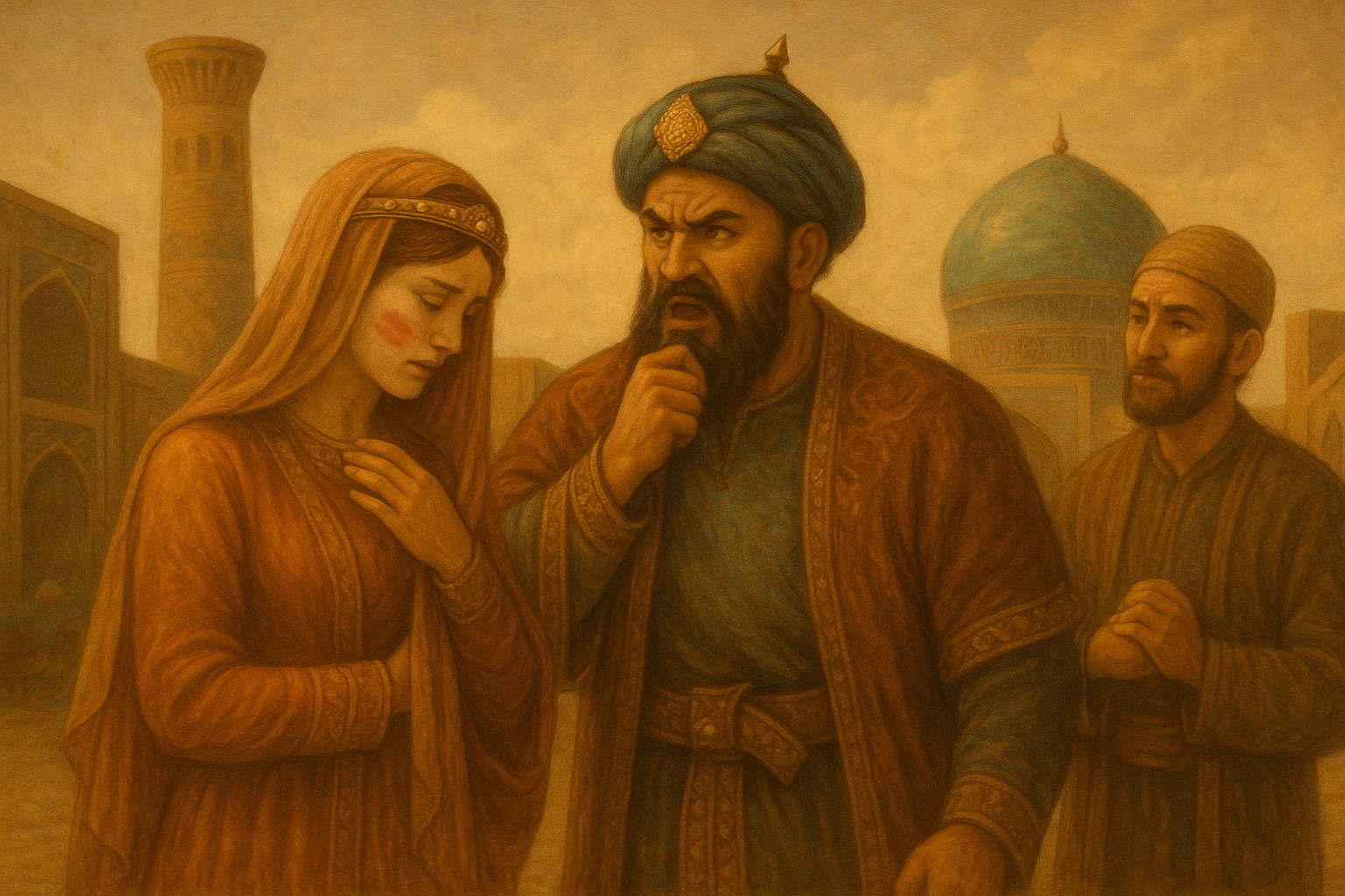 Risaliamo sul pullman. La guida ci intrattiene con una leggenda antica. Bibi-Khanun, principessa prediletta fra le nove mogli di Tamerlano, era talmente attraente da far innamorare perdutamente l’architetto persiano che aveva ricevuto dal sovrano l’incarico di costruire una moschea in suo onore. Durante l’assenza di Tamerlano, il costruttore minacciò di interrompere i lavori se non avesse potuto baciare sulla guancia la bella sposa. Il bacio fu così ardente da lasciare un’impronta indelebile sulla sua gota. Timorosa della reazione del marito, la giovane decise di coprirsi il volto con un velo, e volle imporlo anche alle altre donne. Lo stratagemma non funzionò: Tamerlano scoprì l’adulterio e fece uccidere la pur amatissima consorte.