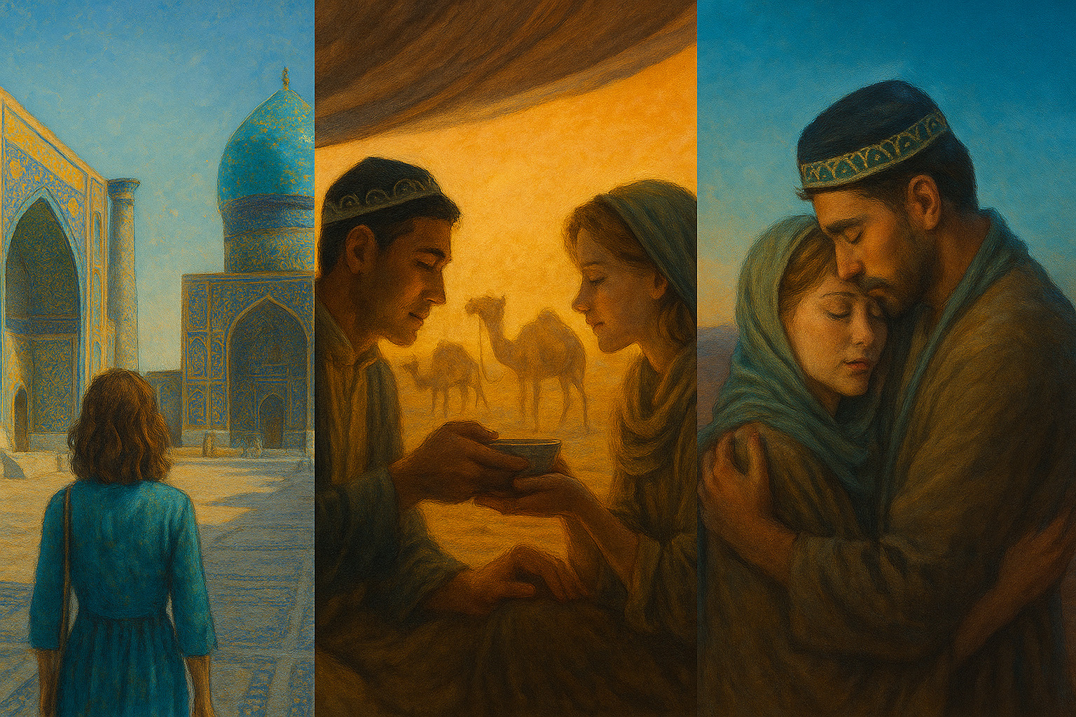 Sento chiamare il mio nome e mi giro: accanto a me un uzbeco che indossa il doppa, il tipico cappello intessuto di fili lucenti. Riconosco la nostra guida. Mi sorride e mi porge una coppetta di tè molto chiaro. “Bevilo, ti darà sollievo dal caldo.” Sorseggio la bevanda leggera e mi sento rinfrancata. Lui mi prende una mano e vi appoggia le sue labbra morbide e sottili. Sono giovane come lui, lo percepisco. Accarezzo il suo bel naso e i fini capelli neri e ardisco di posare la mia bocca sulla sua. Lui mi tiene il capo, infila le dita fra i miei capelli chiari. Mi sussurra che sono la sua principessa e si avvicina per baciarmi, al di là di ogni tempo e luogo, fra le distese rosse di sabbia e le bianche crepe del terreno, sotto un cielo turchese come le cupole lontane lungo la Via della Seta.