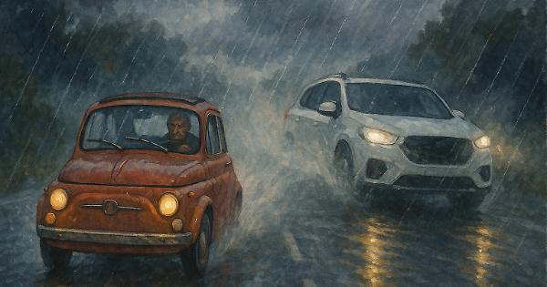 «Ma dove andrà così di fretta con questo maltempo?» si chiese l’anziano guidatore al passaggio del bolide.