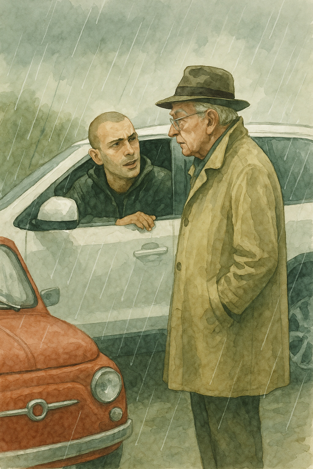 «Ma come avrò fatto?» si chiese ad alta voce il vecchio Oreste, che aveva vissuto migliaia di giorni di pioggia nei quali aveva sfiorato migliaia di auto senza il minimo graffio. Non voleva riconoscere di essere stato l’autore di un incidente stradale, seppure di irrisoria importanza. La sua coscienza non l’ammetteva.