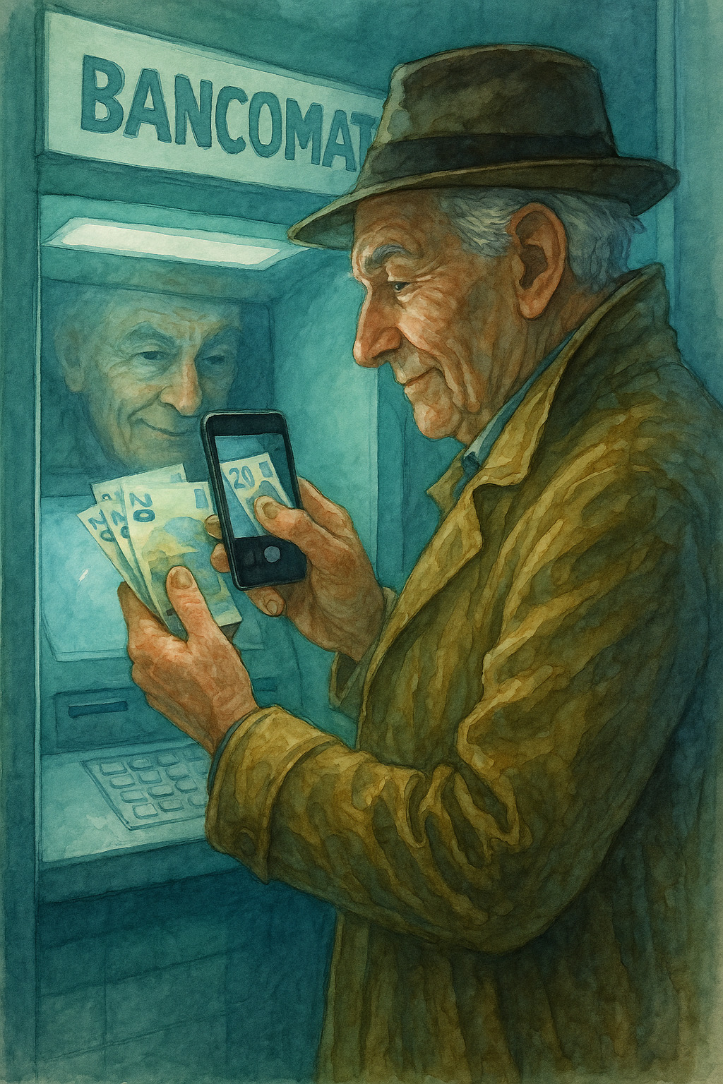 Nella riservatezza dell’androne destinato alla clientela, Oreste prelevò centottanta euro. Col telefonino fotografò i numeri di serie e trattenne per sé quaranta euro. Uscito dal bancomat, consegnò centoquaranta euro al giovane guidatore.
