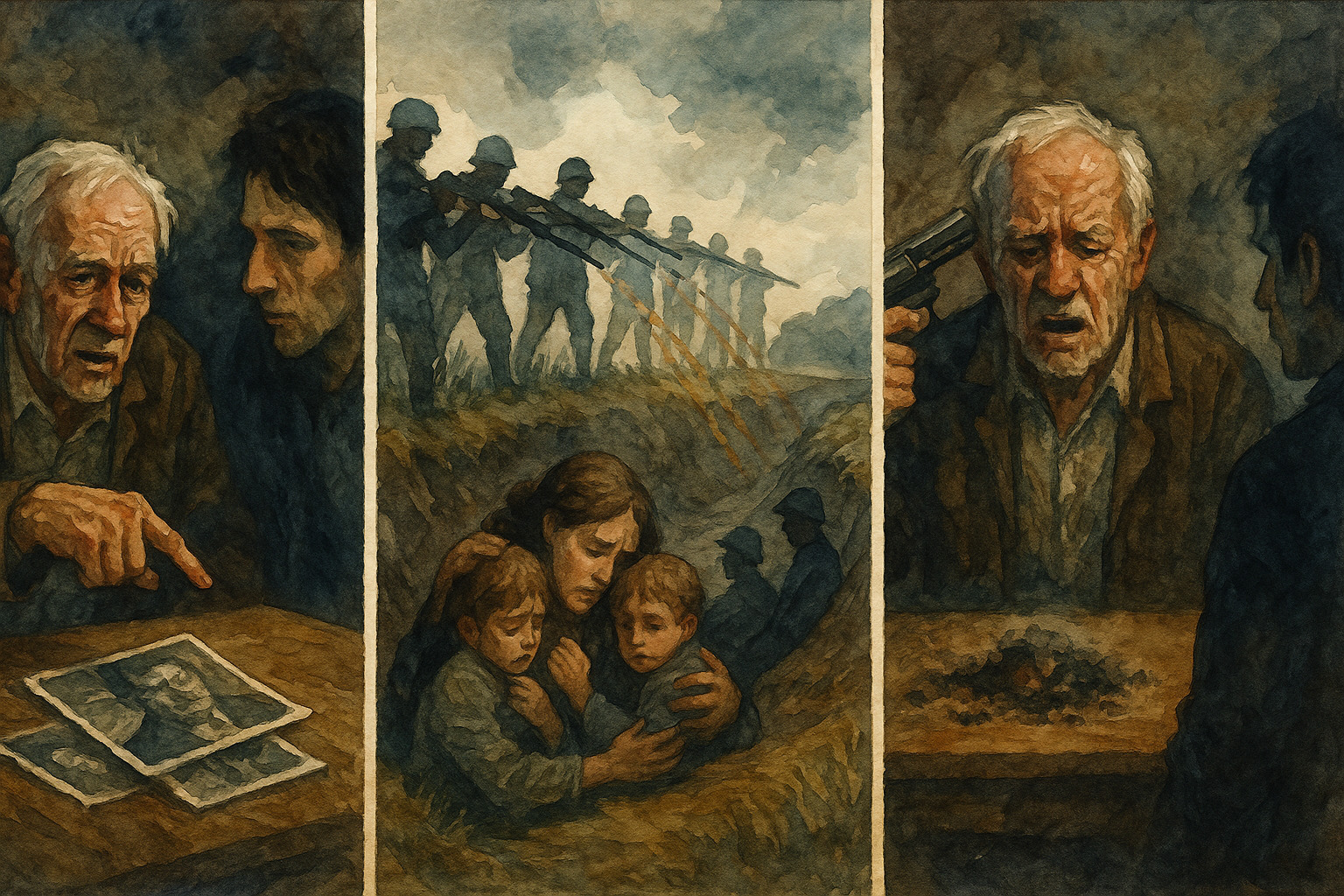 «Spararono con i mitra. Almeno una cinquantina di soldati. Altezza d’uomo, come da ordini. Ma io ero basso, capisci? Non ero ancora un uomo. Non ancora. Mi presero di striscio alla testa e caddi nel fosso. Su di me si accumularono corpi senza vita, i miei genitori, i miei fratelli, i miei vicini di casa… Una catasta di morti che mi permise di restare in vita. Non è grottesco?»