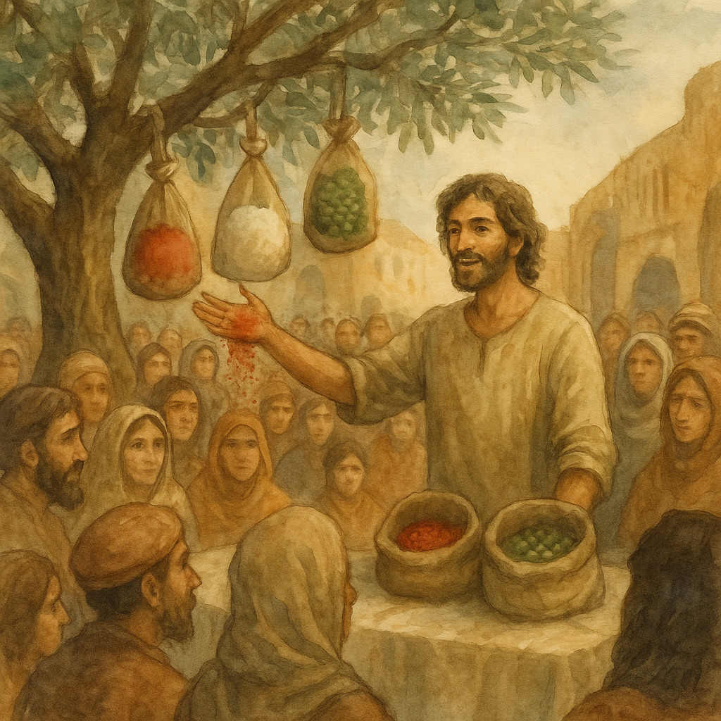Molta gente, incuriosita dalla stranezza della proposta, si avvicinò ancora di più. Allora prese il primo sacco, lo aprì in modo da rendere ben visibile il suo contenuto e ne trasse una manciata di polvere rossa come il sangue, il cuore, l’amore.