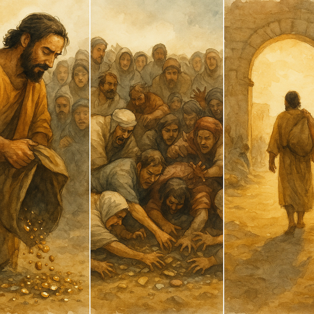 Raccolse i sacchi e lentamente si allontanò, mentre la gente cominciò a lottare tra loro per contendersi il contenuto di quello nero e sporco.