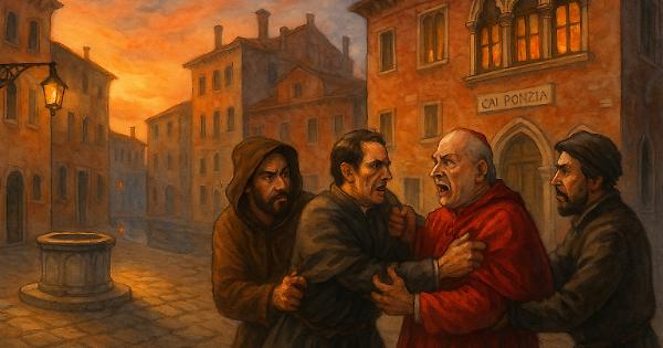 Venezia, 1423, il nove di maggio verso sera. In quello spiazzo, a quell’ora, di fronte a Ca’ Ponzia, detta Ca’ delle Mone, veementi discutevano urlando una tonaca rossa da monsignore e un giubbotto bruno da medico o alchimista.