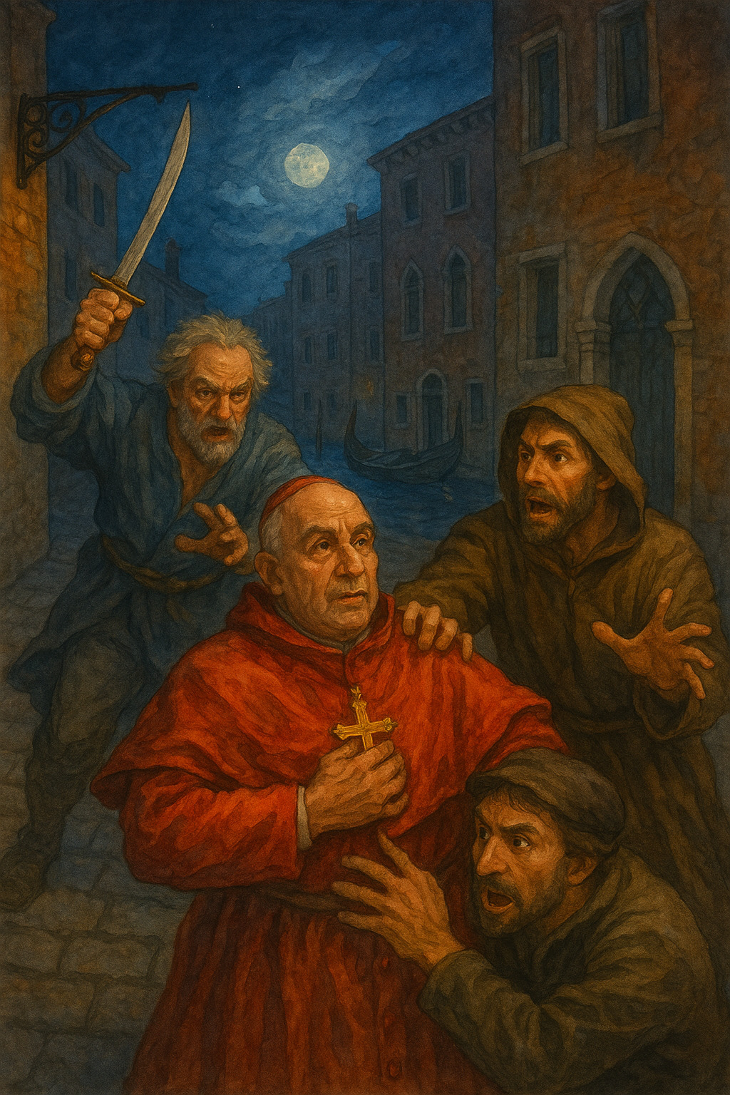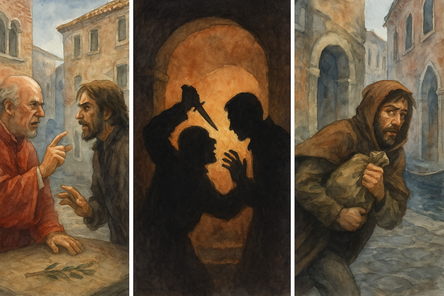 Pensai: «Dopo un monsignore morto, ora ci sarà un giudeo accoppato». Così, con la daga che tenevo nascosta, tagliai la gola ad Astorre. Misi la daga in mano a Mattia e uscii dalla stanza, urlando che i compari si stavano uccidendo.
