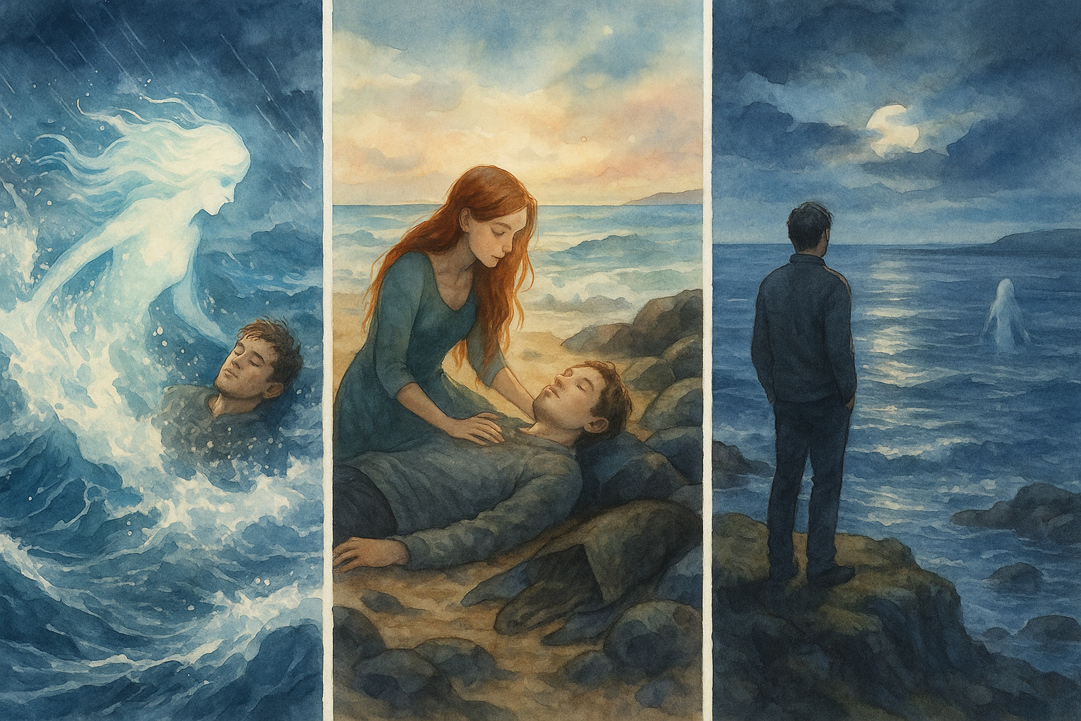Liam si mosse appena: era ancora stordito, ma intuì che la giovane donna addormentata al suo fianco lo aveva vegliato fino ad allora. La Selkie aprì gli occhi e lo guardò senza parlare, poi distolse lo sguardo verso l’orizzonte, dove le onde si spegnevano sulla sabbia.