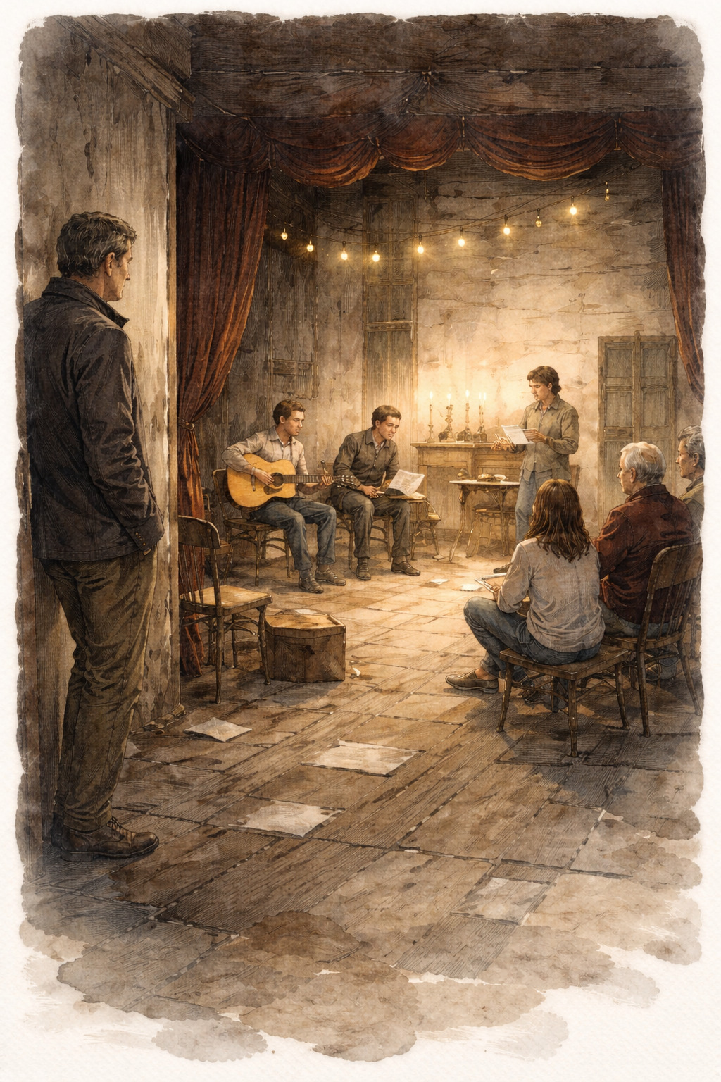 Dentro trovò una decina di persone: giovani, anziani, un insegnante, una barista, un musicista. Stavano provando una piccola rappresentazione teatrale. Non avevano permessi, né fondi, né un pubblico. Solo un bisogno urgente di fare qualcosa insieme.