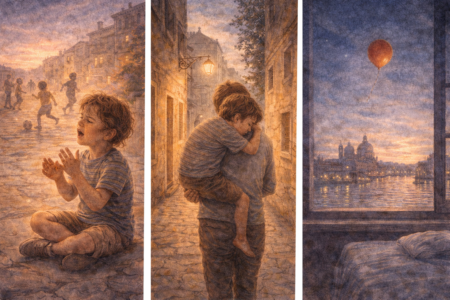 La sera, nella confusione vibrante di Campo Santa Margherita, Luca si sedette e osservò gli altri bambini giocare a pallone. Spinto da un impulso, si lanciò dietro al gioco, inciampò, cadde, ma invece di urlare, rise. Poi, seduto per terra, lontano dai piedi che correvano, iniziò a cantare la sua nenia, ora arricchita: