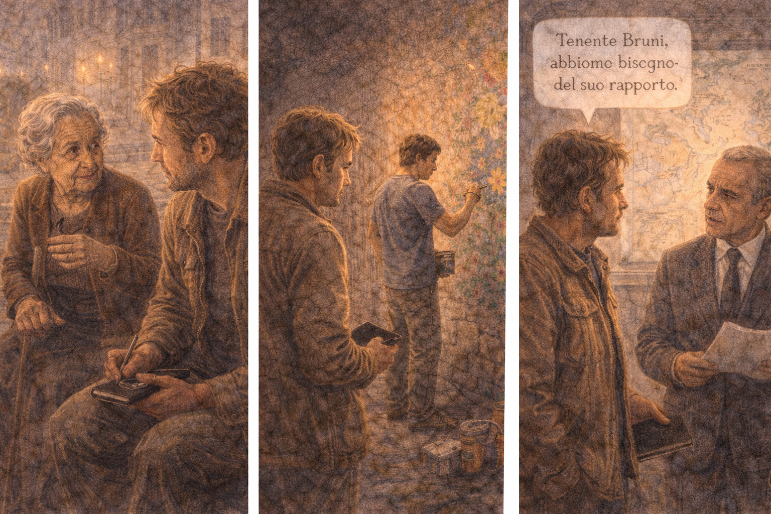 Il suo alloggio era una stanza sopra la biblioteca comunale. Una finestra dava sulla piazza, l’altra su un vicolo stretto dove il sole arrivava solo di rimbalzo. Ogni mattina, il Tenente scendeva presto, prendeva un caffè al bancone e iniziava il suo giro. Non aveva un’uniforme, solo un taccuino nero e un’andatura calma che non metteva paura a nessuno.