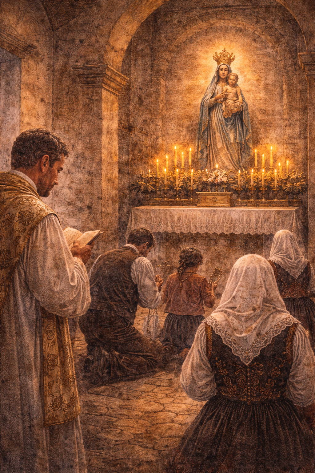 Le donne richiamavano i bambini, per educazione, più che per volontà, scuotendo le lunghe gonne nere dalla polvere della strada, pronte per la salita finale verso il santuario, una chiesetta solitaria in cima al monte Gonare. Trascinando i bambini recalcitranti, il rosario in mano, intrapresero con fede la seconda parte del cammino, pronte a inginocchiarsi, una volta arrivate, sulla dura pietra della chiesetta, povera anch’essa, come loro, ma ricca di speranza. L’attesa era finita, la statua della Madonna troneggiava dietro l’altare e li guardava con occhi misericordiosi. Li avrebbe ascoltati, pensavano sotto i pesanti fazzoletti che coprivano il capo, era una mamma anche lei. Le litanie dei Gosos riempivano l’aria, satura del fumo delle numerose candele accese in voto, la voce stentorea del sacerdote ripeteva preghiere e formule in una lingua sconosciuta per loro, ma che risvegliava antichi sentori e strappava calde lacrime ai chiedenti grazia.