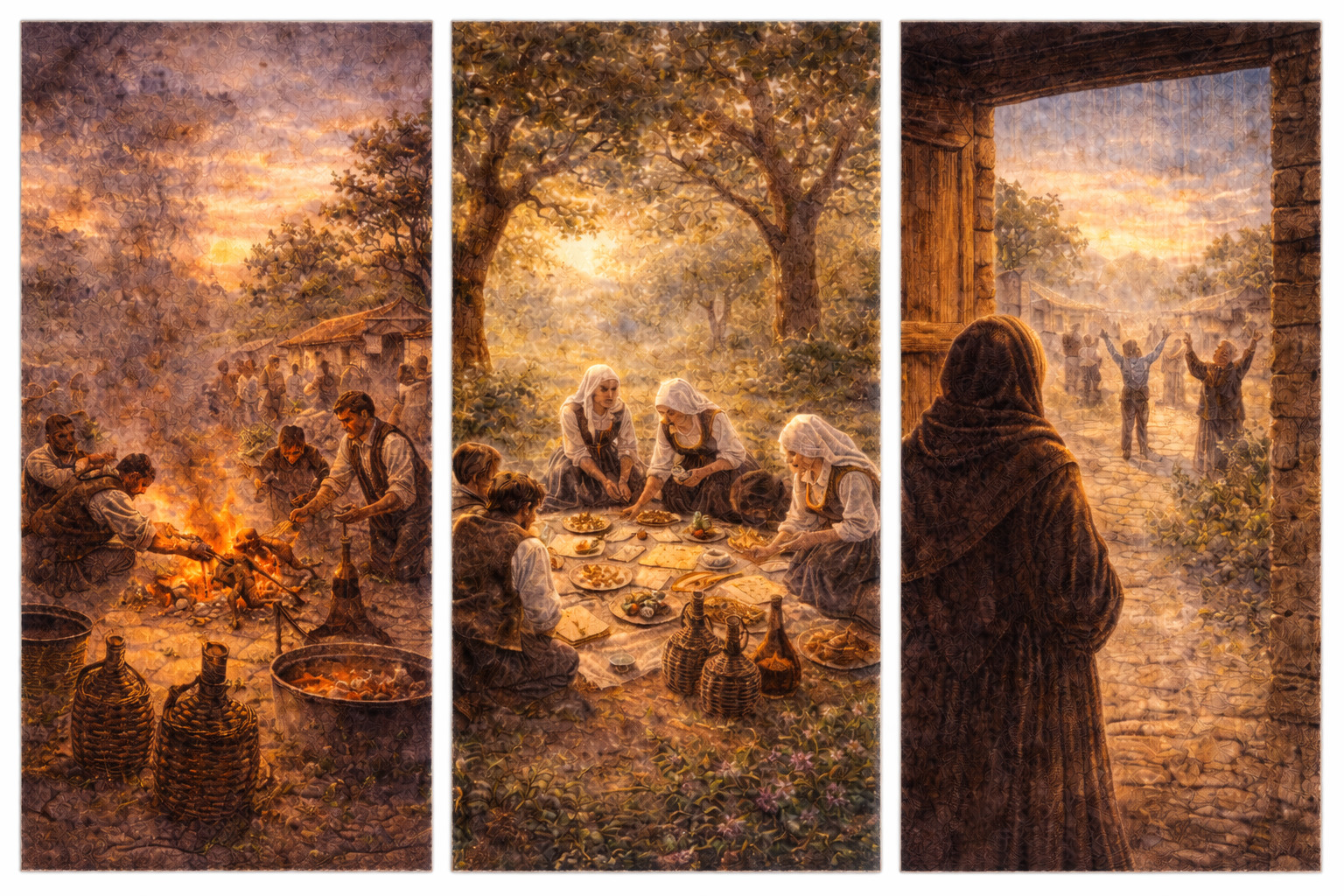 La discesa fu più veloce, quasi leggera, come se si fossero liberati di un peso. Il folto gruppo dei pellegrini si fece ad un tratto compatto, i bambini non si allontanavano più, si tenevano stretti alle gonne delle madri. La piazza antistante le povere casupole in pietra si era riempita di gente, numerosi fuochi ardevano agli angoli, diffondendo un fumo nerastro, gli uomini accovacciati per terra erano impegnati a girare gli spiedi, dove la carne veniva rosolata con calma e pazienza, facendo sgocciolare sopra di essa un pezzo di lardo acceso. Avrebbe reso la cotenna croccante e saporita, di un colore bruno con riflessi dorati, da masticare lentamente in bocca, per assorbirne il piacere, come una cosa divina, e sentire il grasso scorrere dalla bocca in gola, spinto da quel vino corposo che passava di mano in mano, di bocca in bocca, come un canto a più note, in grossi fiaschi rivestiti di asfodelo, lavorato e intrecciato da mani sapienti. Il profumo del maialetto arrosto giunse alle loro narici, soprattutto a quelle dei più piccoli, facendo abbassare il capo ai loro padri, che sentirono in quel momento tutta la loro miseria, e l’impossibilità di far assaggiare loro anche un solo pezzetto di quel succulento piatto. I grossi pentoloni sobbollivano nel fuoco, facendo cuocere al loro interno carne di pecora con patate e cipolla. Una prelibatezza che anche i pellegrini si concedevano alle feste comandate, con il pane carasau bagnato velocemente nel brodo, ricoperto di grasso e profumato dalla carne insaporita dai pascoli sardi, ricchi di erbe spontanee, che donavano alla carne e al latte un aroma inconfondibile.