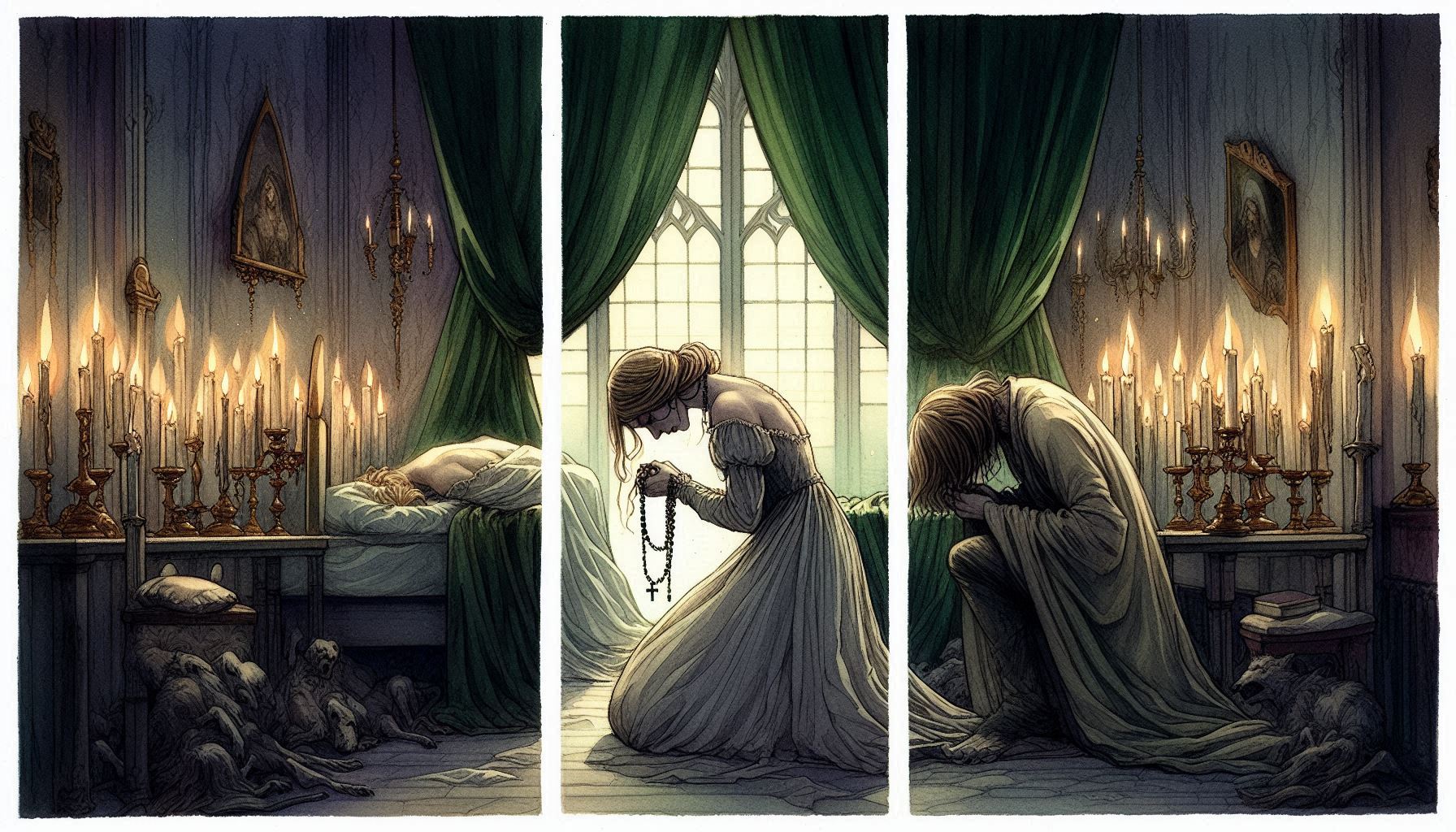 A quelle parole il cuore di Pierbaldo fece un piccolo scatto. La fissò meglio: non era la Morte, ma una donna vera, con occhi lucidi e mani calde. Sedettero sul tappeto di velluto e iniziarono a parlare, dapprima con cautela, poi con confidenza: di madri che se ne erano andate, di botteghe silenziose, di sere passate a pregare o a contare le ore.