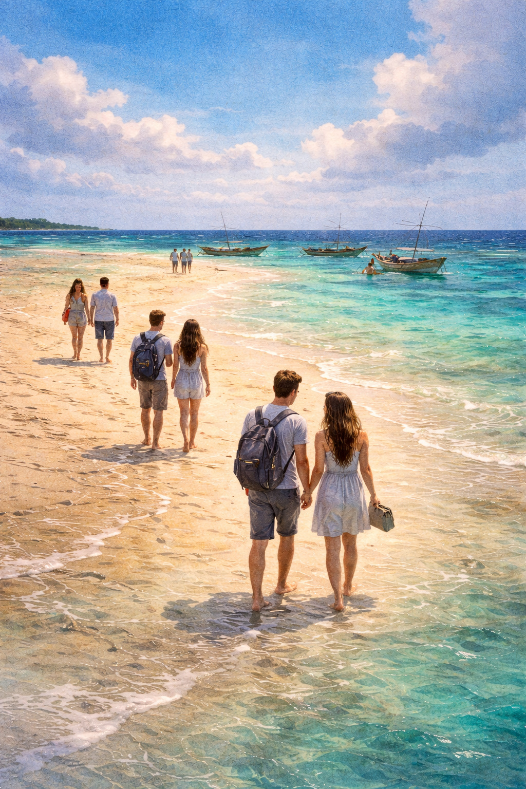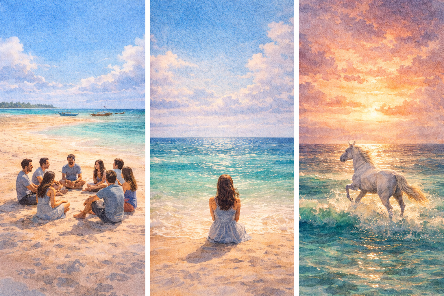 Una mattina, dopo aver passeggiato sui fondali, ci siamo seduti con altre coppie sulla morbida sabbia, dando vita – come se fossimo in un salotto – a una conversazione piacevole, nel corso della quale ognuno di noi ha raccontato le proprie storie d’amore e le proprie esperienze di vita.