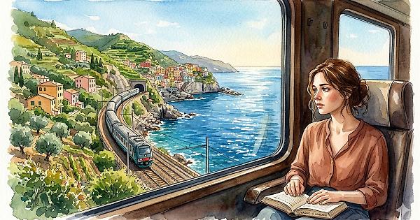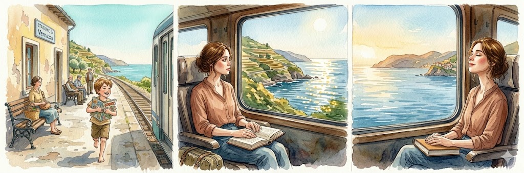 I binari sembravano disegnare una linea fragile che separava due mondi: quello dell’acqua, che brillava sotto il sole di mezzogiorno, e quello della terra, punteggiato da ulivi, casette color pastello e piccoli borghi incastonati come pietre preziose.