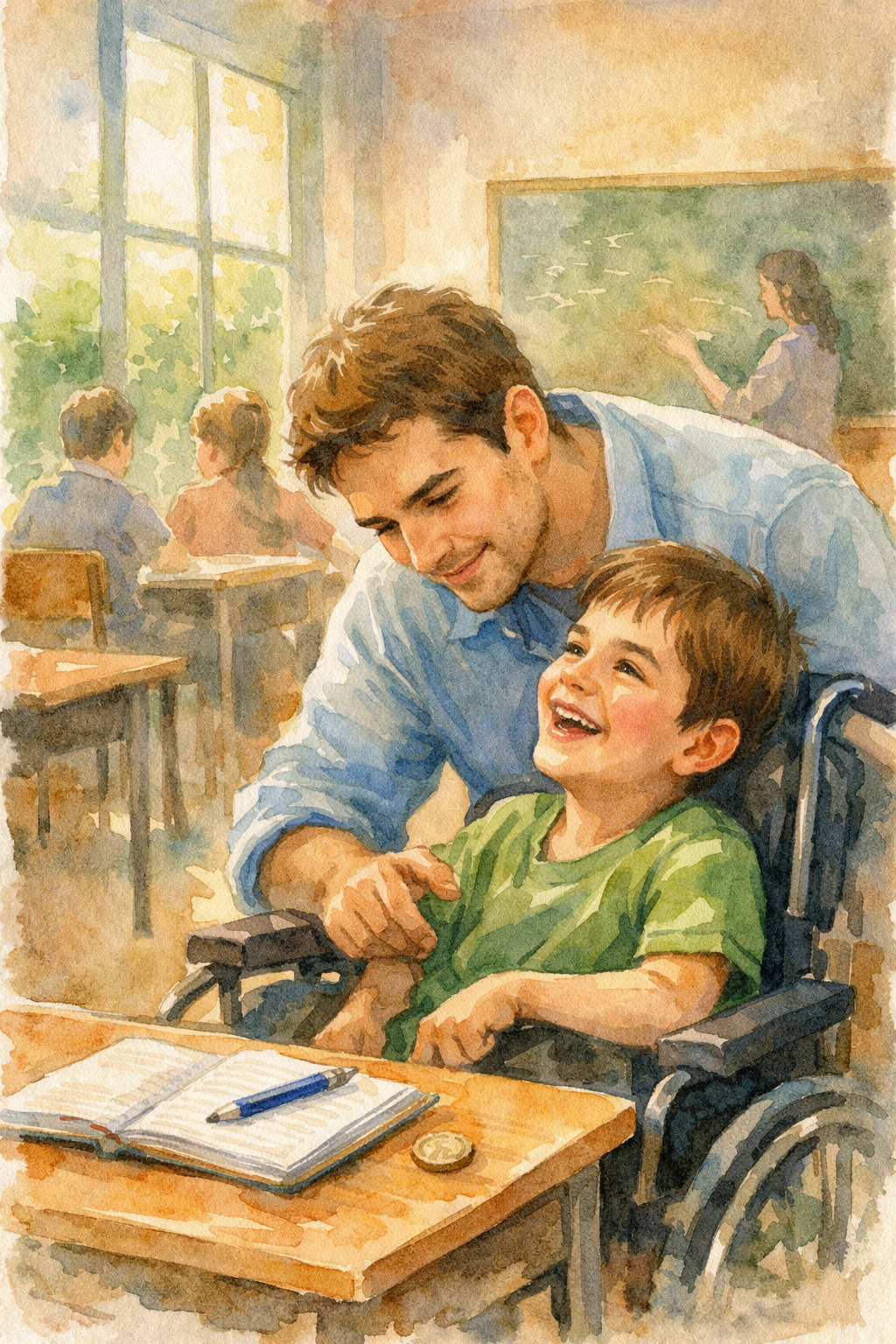 Questo suo movimento indica gioia e dolore: sta a me interpretarlo. La scuola è un istituto professionale immerso nel verde e circondato da tanto giardino, ideale per portarlo al bar per fare colazione, rigorosamente pagata da lui. La mia collega di sostegno mi dà una mano e, mentre prendiamo un caffè, lo imbocca; poi torniamo in classe.