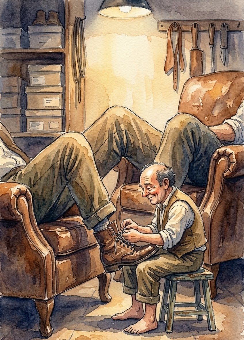 L’uomo poté così continuare a realizzare il suo ruolo nella società, dedicandosi a slacciare le scarpe ai passanti. All’inizio lo prendevano in giro. La nuova insegna fuori della sua bottega parlava chiaro: «Slaccio scarpe a chiunque sia in cerca di respiro per i propri piedi!»