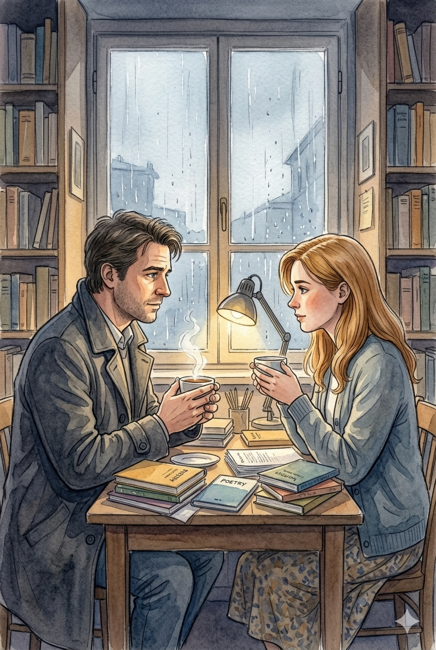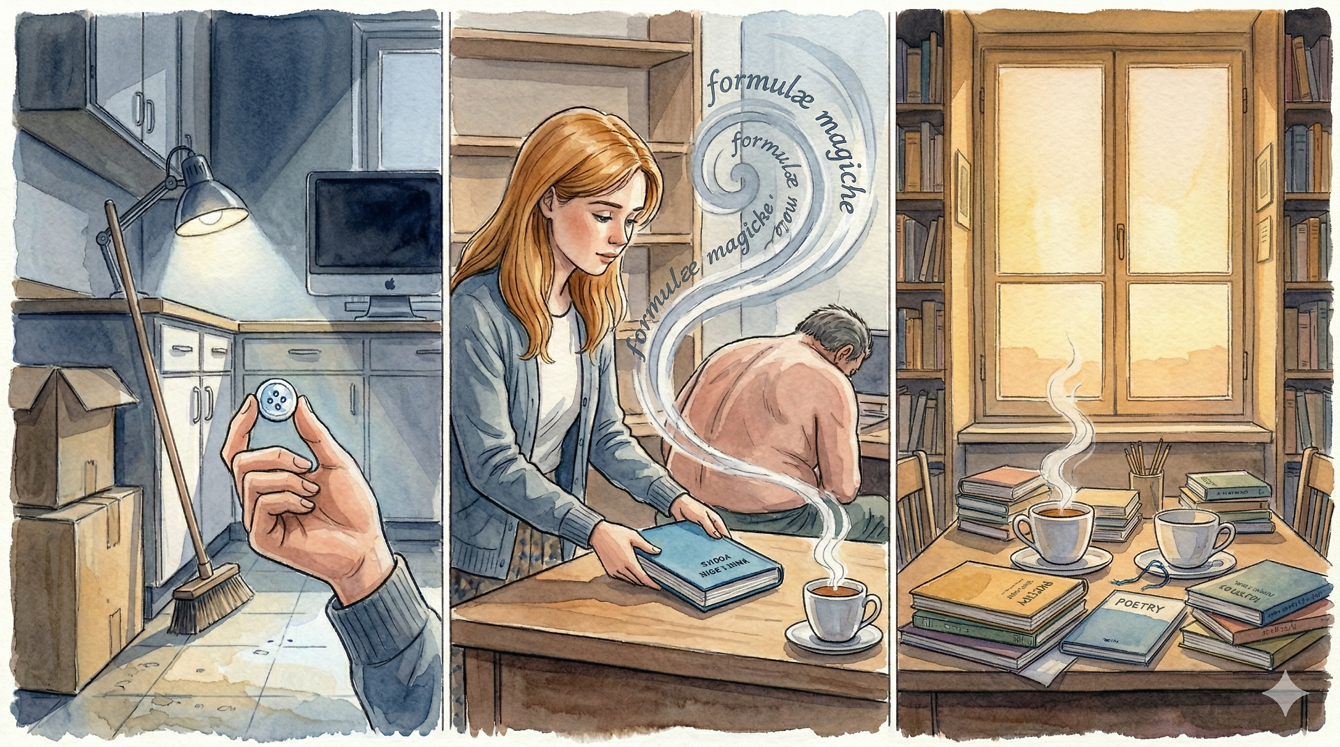 Un giorno pioveva. Lui arrivò in ritardo, con le spalle bagnate e le mani rosse. Lei gli offrì una tazza di tè caldo nel retrobottega. Rimasero seduti in silenzio, ascoltando l’acqua sulle finestre e il ronzio della stampante.