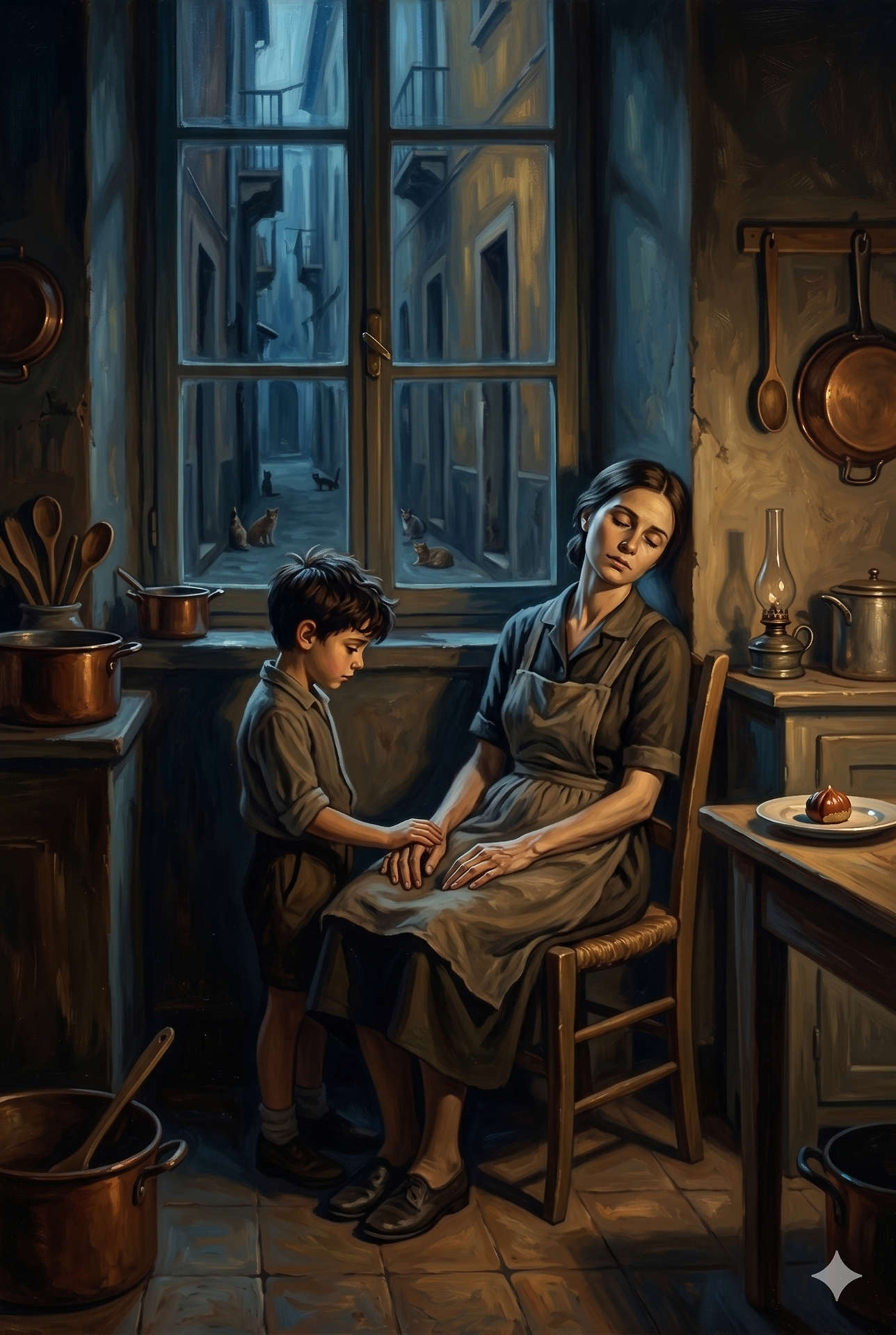 Io passavo tutto il tempo nel balcone per il timore dei baci e degli abbracci delle signore che nella foga mi stringevano, facendomi sentire l'umido sudore delle ascelle. «Che bel bambino ti sei fatto!» mi dicevano con la voce stridula. Marta mi guardava da lontano con gli occhi lucidi e la bocca socchiusa in un timido sorriso.