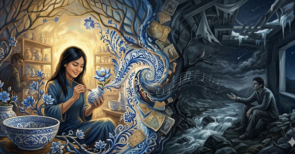 Il testo ci trasporta tra i colori e i rumori di un mercato lontano, dove un incontro casuale si trasforma in un’emozione che dura una vita. L'atmosfera è quella di un incanto improvviso: mentre intorno tutti gridano, l'attenzione si ferma su una ragazza che dipinge con estrema calma, rendendo un semplice oggetto di ceramica qualcosa di prezioso e unico.