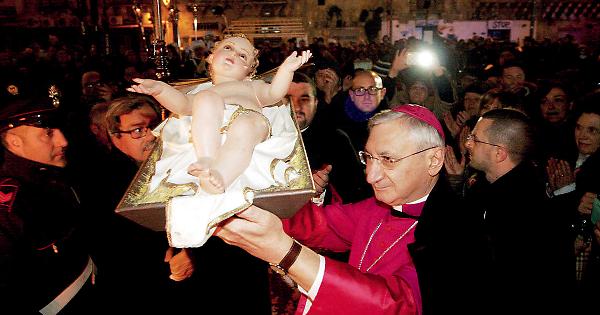 Nella mattinata del 25, in Città vecchia, appuntamento con la processione de “’U Bammine curcate” (Gesù Bambino nella culla) curata dalla confraternita della Trinità, nella caratteristica mozzetta rossa recante la “cozza San Giacomo”, simbolo dei pellegrini che si recavano a San Giacomo di Compostela. Al suono delle pastorali eseguite dalla banda “Santa Cecilia”, il Bambinello muoverà dalla basilica cattedrale alle ore 11 per percorrere via Duomo, piazza Castello, pendio La Riccia, via Di Mezzo, via Sant’Egidio, via Garibaldi, vico e postierla Via Nuova, piazzetta San Costantino, via Duomo con rientro in basilica cattedrale. Un tempo la processione partiva all’alba dalla chiesetta della SS.Trinità, all’inizio di via Duomo, poi demolita per far emergere le colonne doriche. Racconta lo studioso Alfredo Majorano che il Bambinello era atteso alla Marina da numerosissimi pescatori “jaccarule” con una fiaccolata fatta con i “frezzuljidde”.