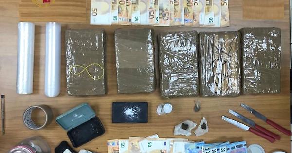 In uno zaino, gli agenti hanno rinvenuto: 5 panette di cocaina dal peso complessivo di circa 6 kg; 1 contenitore in metallo contenente all’interno vari tocchetti di hashish, avvolti in carta da forno, dal peso complessivo di 20 grammi circa; 1 involucro di forma cilindrica, avvolto con cellophane trasparente contenente all’interno hashish, a forma di dischi del peso complessivo di 40 grammi circa; 1 contenitore in vetro chiuso con gancio ermetico contenente Marijuana, dal peso complessivo di 25 grammi circa; 2 bilancini elettronici di precisione perfettamente funzionanti, 3 coltelli da cucina la cui lama era ancora intrisa di sostanza stupefacente; 2 rotoli di cellophane trasparente per uso domestico, utilizzato generalmente per confezionare la sostanza stupefacente.