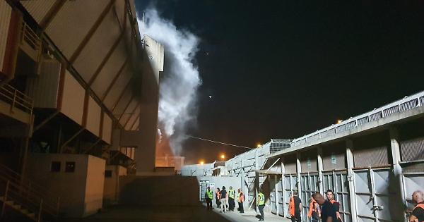 Al momento non si conoscono le cause dell'incendio, le forze dell'ordine e i vigili del fuoco sono prontamente intervenuti e hanno fatto evacuare la sala stampa dove stava per prendere la parola l'allenatore rossoblù Eziolino Capuano. Da sottolineare che i tifosi foggiani erano entrati allo stadio al quarto d'ora della ripresa e dal loro settore erano stati lanciati fumogeni all'interno del perimetro di gioco.