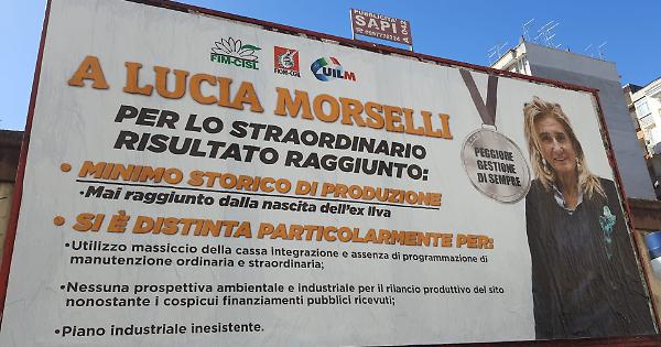 Città tappezzata di manifesti 6x3 contro Lucia Morselli, amministratore delegato di Acciaierie d'Italia. L'iniziativa porta la firma delle sigle confederali dei metalmeccanici Fim Cisl Taranto-Brindisi, Fiom Cgil Taranto e Uilm Taranto.