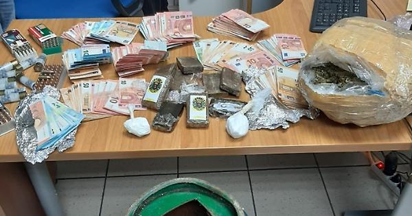 Al suo interno i poliziotti hanno recuperato 10 panetti di hashish, per un peso complessivo di circa un chilogrammo, una busta di cellophane contenete marijuana per circa 70 grammi ed in un vasetto due involucri in cellophane di colore bianco contenenti cocaina per circa 90 grammi.