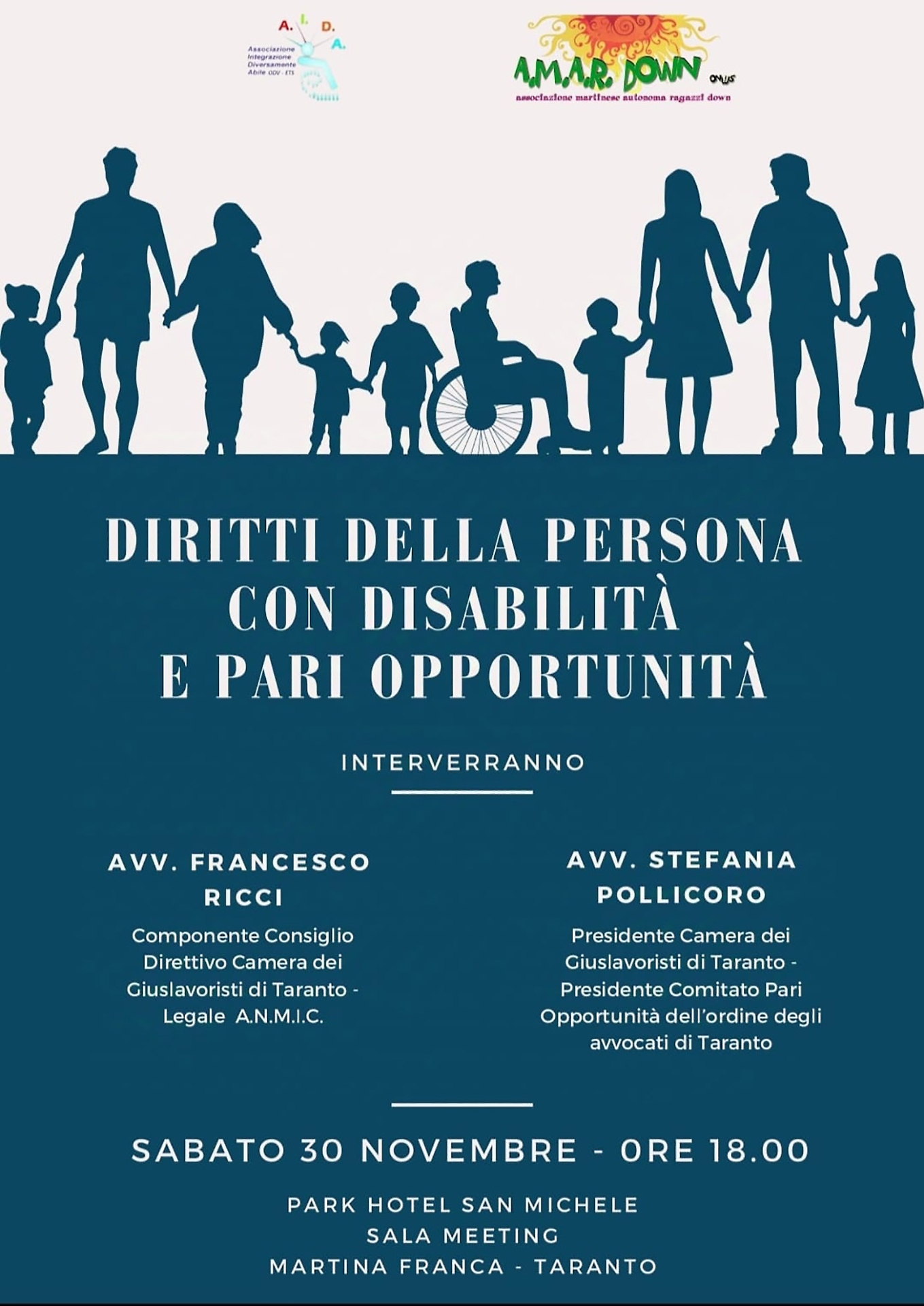 L’associazione A.I.D.A. (associazione per l'integrazione delle persone con disabilità) e l’associazione A.M.A.R. DOWN (Associazione Martinese Autonoma Ragazzi Down) organizzano l’incontro “Diritti della Persona con disabilità e pari opportunità”.