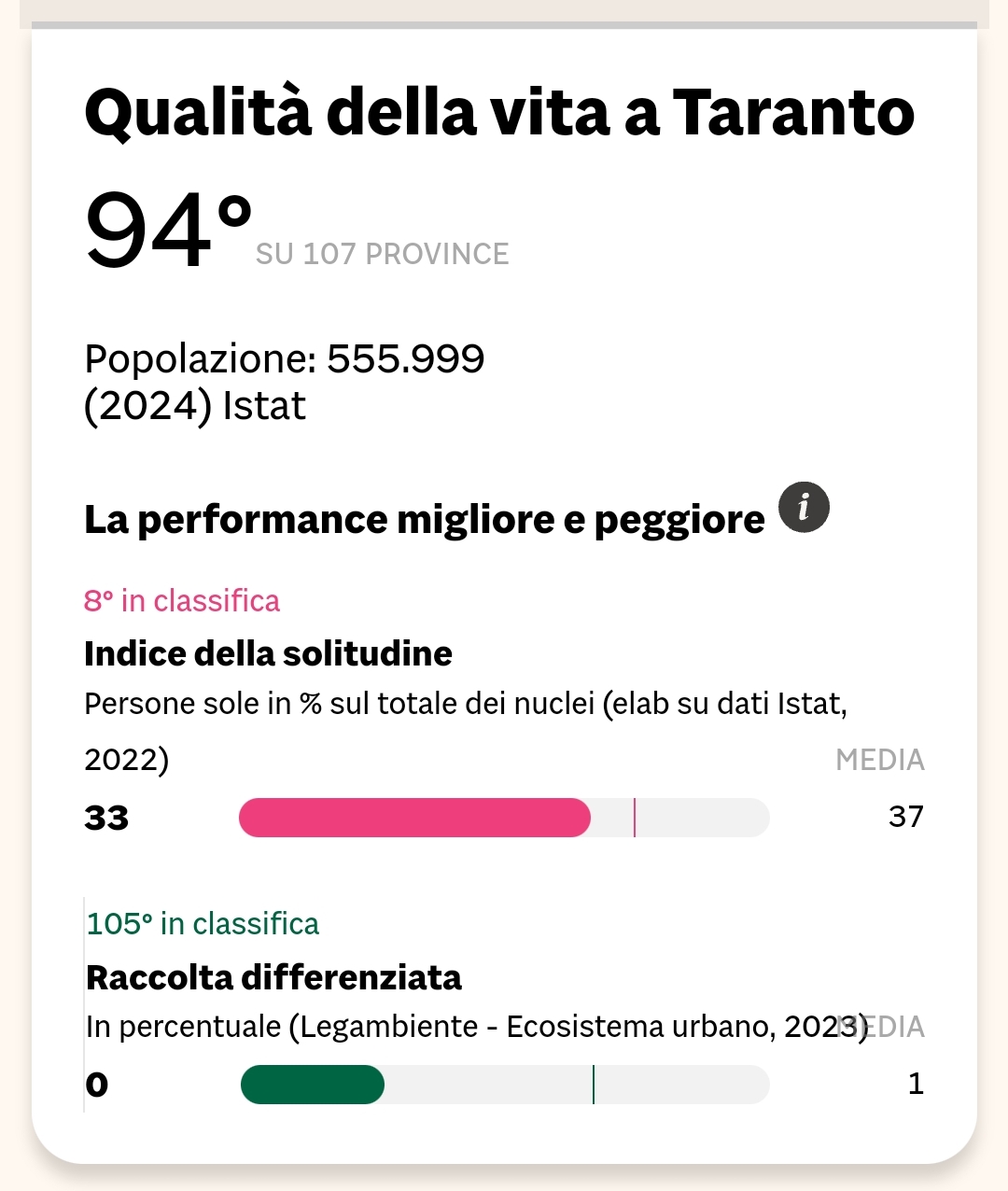 Taranto resta nella parte bassa della classifica della Qualità della Vita in Italia diffusa oggi, 16 dicembre, da Il Sole 24Ore: novantaquattresimo posto. In Puglia fa peggio solo Foggia, novantanovesima a livello nazionale. Sorride Bari, sessantacinquesimo posto. Non male Lecce, settantaduesima. Bat è ottantaseiesima, Brindisi ottantanovesima.