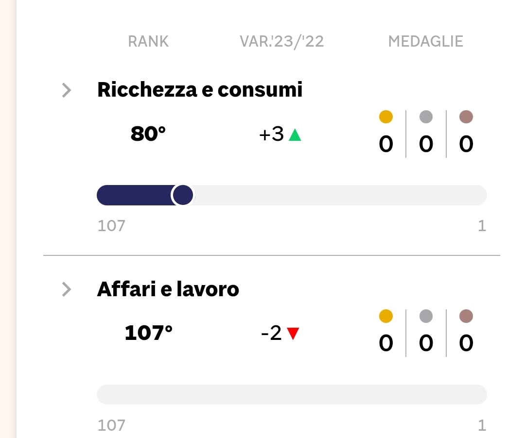 Soffre l'occupazione: in "affari e lavoro" ultimo posto a livello nazionale. Drammatico il dato della cassa integrazione: 105esimo posto a livello nazionale per quanto riguarda il numero di ore di cig autorizzate. Ed è da interpretare allora un indicatore come "ricchezza e consumi": ottantesimo posto a livello nazionale, con un incremento di tre posizioni. Senza lavoro, ma più ricchi. O con più ricchezza, però per pochi.