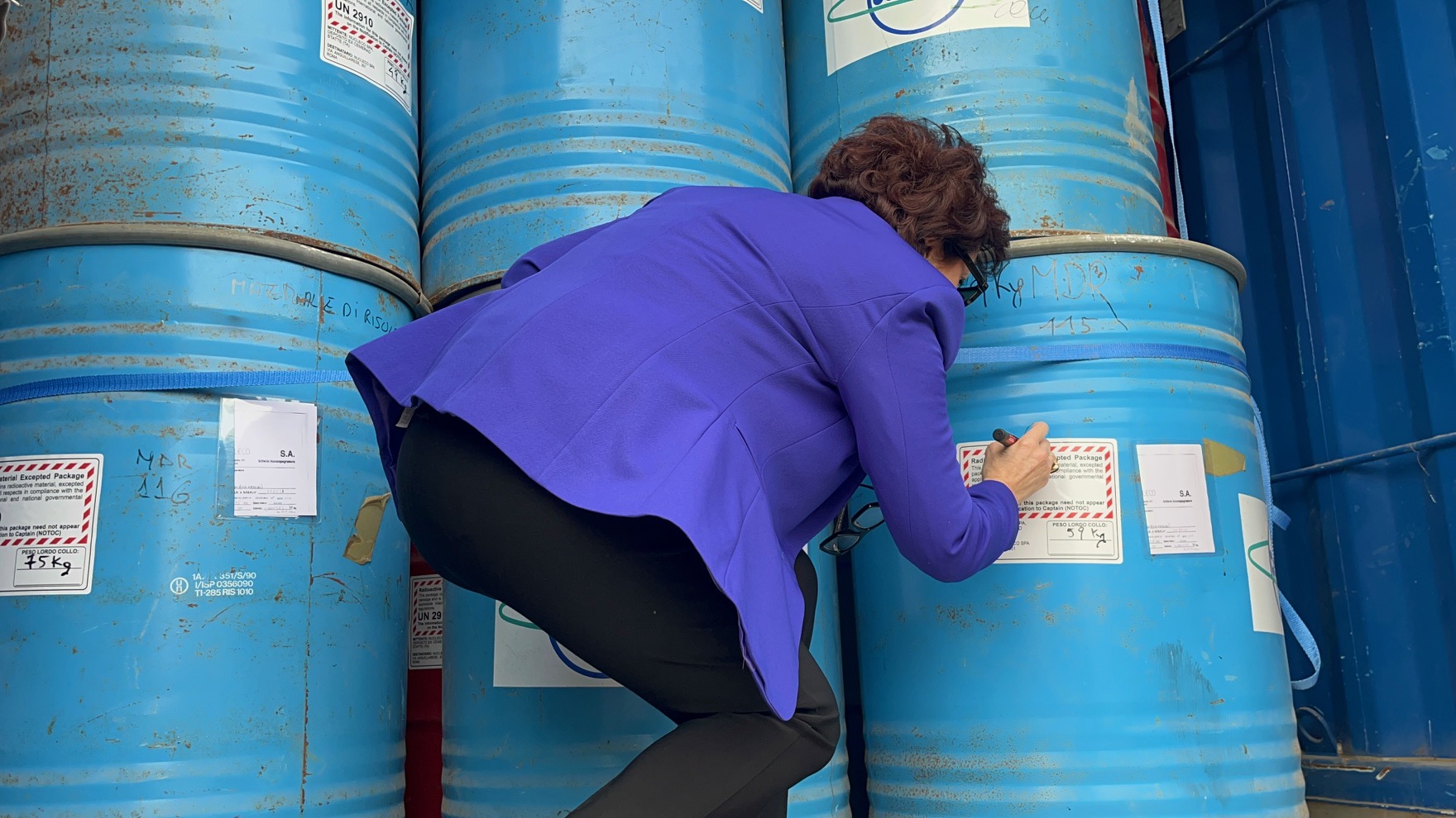 Il commissario Vera Corbelli; alle sua spalle il tir con gli ultimi fusti portati via