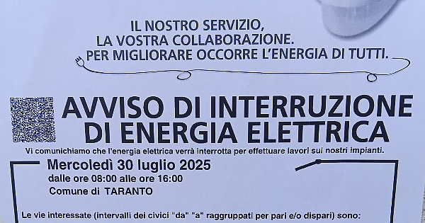 Una interruzione dell'energia elettrica della durata di otto ore. Con il caldo devastante della fine di luglio a Taranto. Nel pieno della giornata lavorativa. E dopo che lo stesso disagio è stato subito soltanto qualche settimana fa, alla fine di aprile.