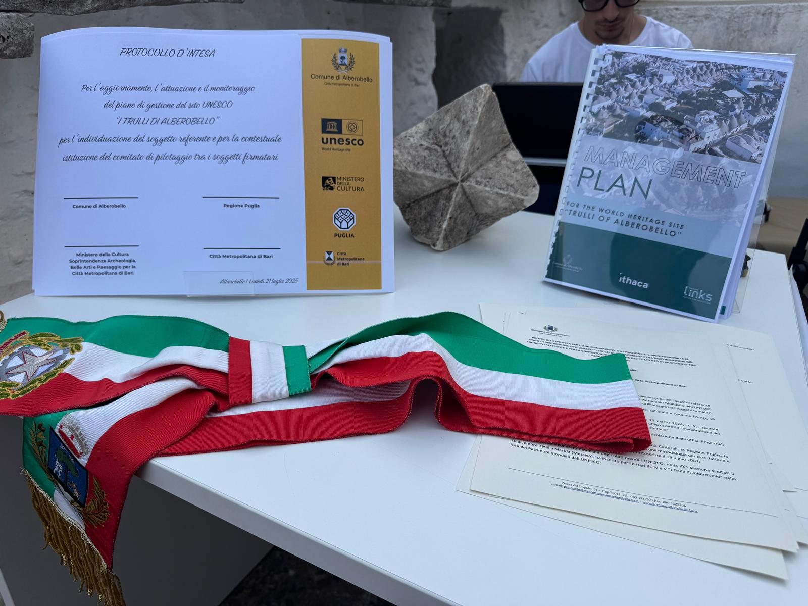 ALBEROBELLO - È stato ufficialmente sottoscritto al Museo del Territorio di Alberobello il Protocollo d’intesa per l’attuazione, l’aggiornamento e il monitoraggio del Piano di Gestione del sito UNESCO “I trulli di Alberobello”, approvato poche ore prima con una delibera di Giunta comunale. Si tratta di un passo decisivo per la salvaguardia e la valorizzazione del borgo patrimonio dell’umanità.