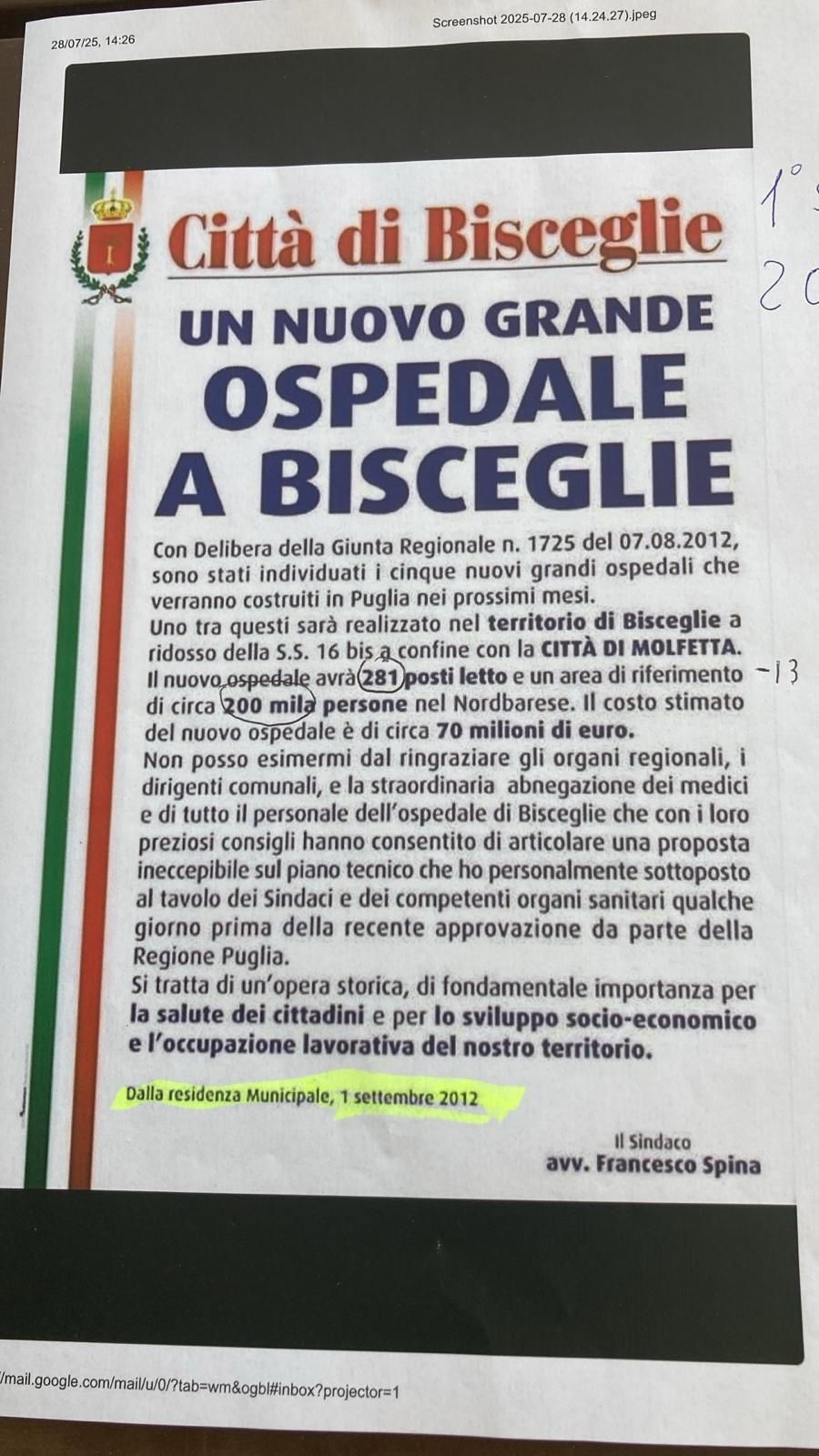 L’ex sindaco e attuale consigliere comunale di opposizione Francesco Spina ha ricordato come l’iter sia partito nel settembre 2012, quando i sindaci del nord barese sottoscrissero un protocollo d’intesa – firmato anche da lui – per individuare il sito in cui realizzare la struttura sanitaria. La scelta ricadde su Bisceglie, in un’area adiacente alla statale 16 bis, al confine con Molfetta. Nello stesso anno, la Regione Puglia, allora guidata da Niki Vendola, recepì la decisione e la giunta regionale approvò la localizzazione del nuovo ospedale. Due anni più tardi, nel 2014, un’ulteriore delibera consolidò definitivamente la scelta.
