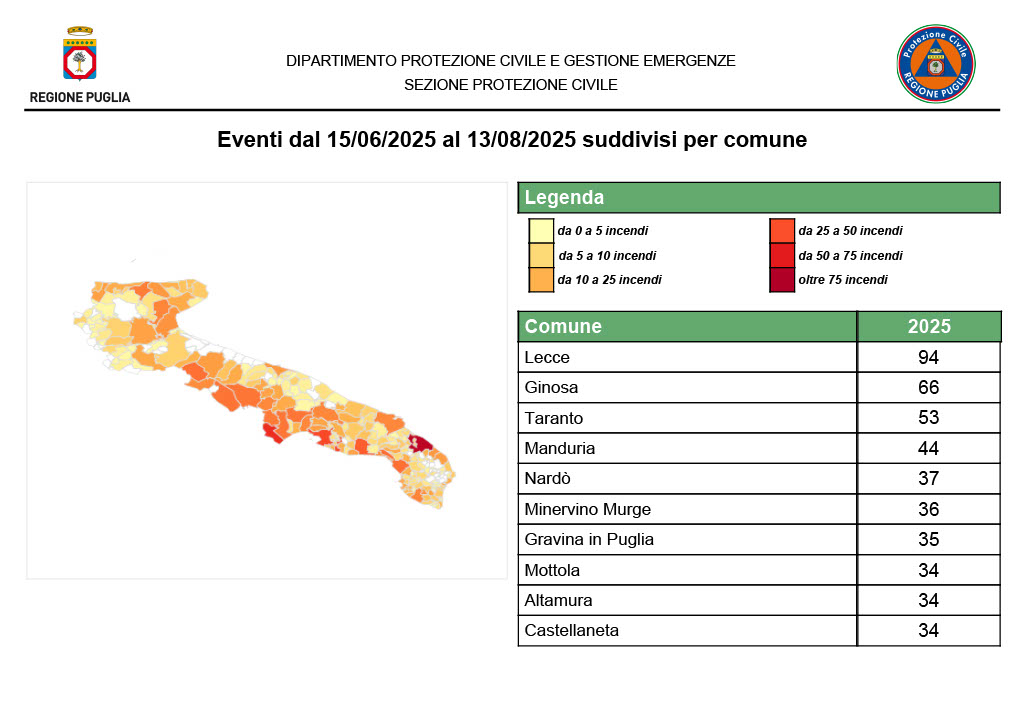 Dall’inizio della stagione e fino al 13 agosto, in Puglia sono stati registrati 1.851 interventi gestiti dalla SOUP. A livello provinciale, il primato spetta a Lecce con 602 operazioni, seguita da Taranto con 455 (in netto aumento rispetto alle 325 dell’anno scorso) e Foggia con 295. La provincia di Bari ha contato 252 episodi, Brindisi 126 e la BAT 89.