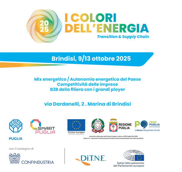BRINDISI - Brindisi diventa il laboratorio nazionale della transizione energetica. Dal 9 al 13 ottobre il capoluogo adriatico ospiterà “I Colori dell’Energia – Transition & Supply Chain”, evento organizzato con il sostegno di Confindustria, l’Alto patrocinio del Parlamento Europeo e del Ministero dell’Ambiente e della Sicurezza Energetica, oltre al supporto della Regione Puglia e del Distretto Tecnologico Nazionale dell’Energia (DiTNE).